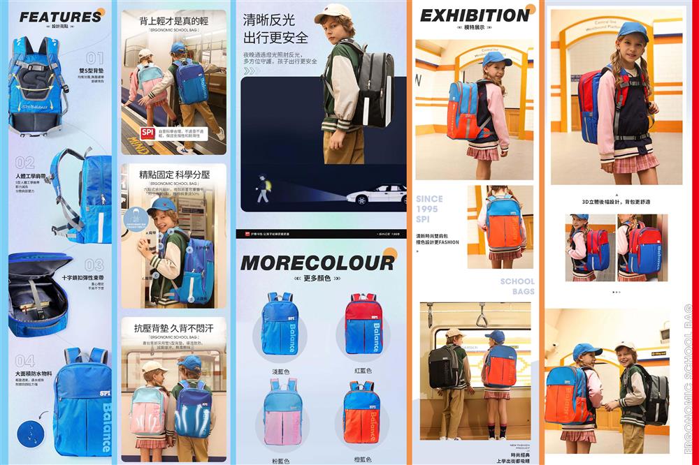 【功能】 1. 護脊纖維條, 保障孩子脊骨挺直  2. 內置底板, 分散壓力及增強承托力  3. 可上下調節的胸帶扣固定背包緊貼身體  4. 腰帶扣幫助固定背包減輕脊骨負重  5. 書包護背散熱功能極佳  6. 羽量級設計  7. 羽量級物料  8. 高反光物料提供安全保障  9. 防水